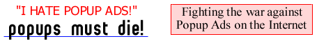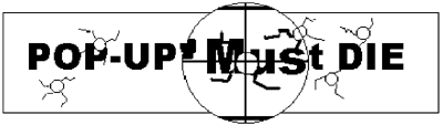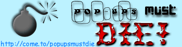 http://paradigm.nu/popupsmustdie If you are really serious about helping to stop these stupid popup banners, do something constructive! Tell your friends about sites like this. Come up with new and ingenious ways to make the popup banners stop! Send me some banners you've created. I know you are all a bunch of whiz-kids out there. These companies who abuse Popups probably hired a bunch of kids like us to write the code in the first place!